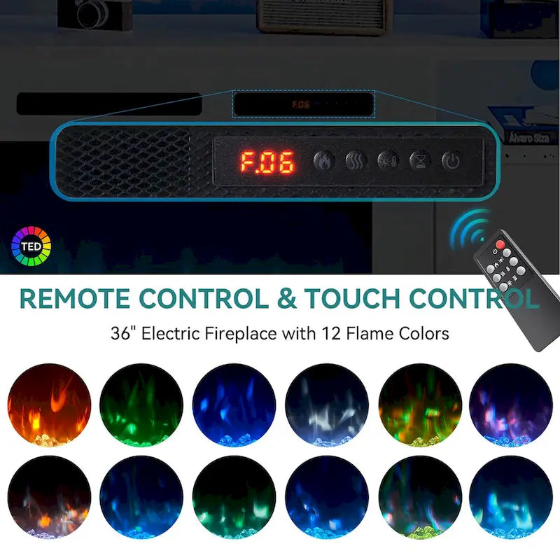 TV Stand with Electric FireplaceOur fireplace TV stand is equipped with a white 36 electric fireplace, which comes with 12 colors of backlight, 12 colors of light strip, 12 flame colors and 5 levels of flame brightness, providing different viewing experience and ambience with the remote control. You can adjust the temperature from 60F to 99F and the time setting is from 0 to 9 hours. It has 5000BTU powerful heat output, and the overheating protection device to further ensure the safety.