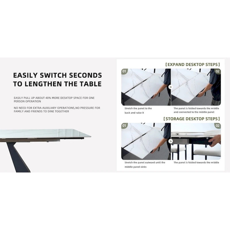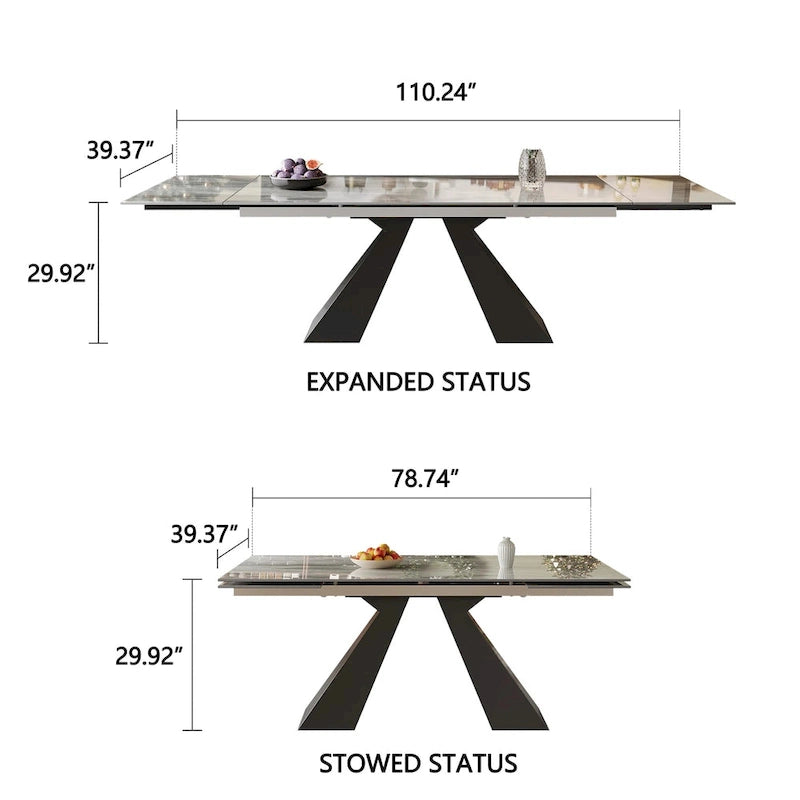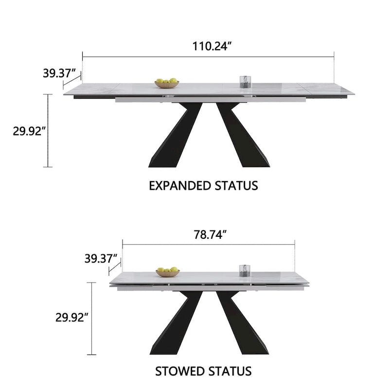 Extendable table The sintered stone table top has a hidden extended tabletop section at the bottom, and the overall length of the dining table ranges from 78 to 110. It can hold up to 8-10 people,which is perfect for accommodating larger gatherings.