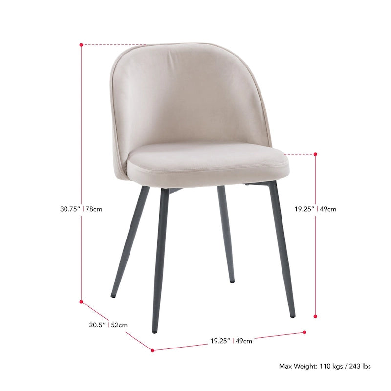 This side dining chair features a slightly curved silhouette, and tapered, matte grey finished legs for a mix of mid-century and contemporary glam style for your dining space. Matte grey metal legs support a soft velvet upholstered back and seat for a luxe look. This chair is a multi-purposeful piece and can be used as a dining chair, accent chair, vanity chair, and more. The soft upholstery is foam-filled to give you plenty of support. Simply attach the legs and take your seat!