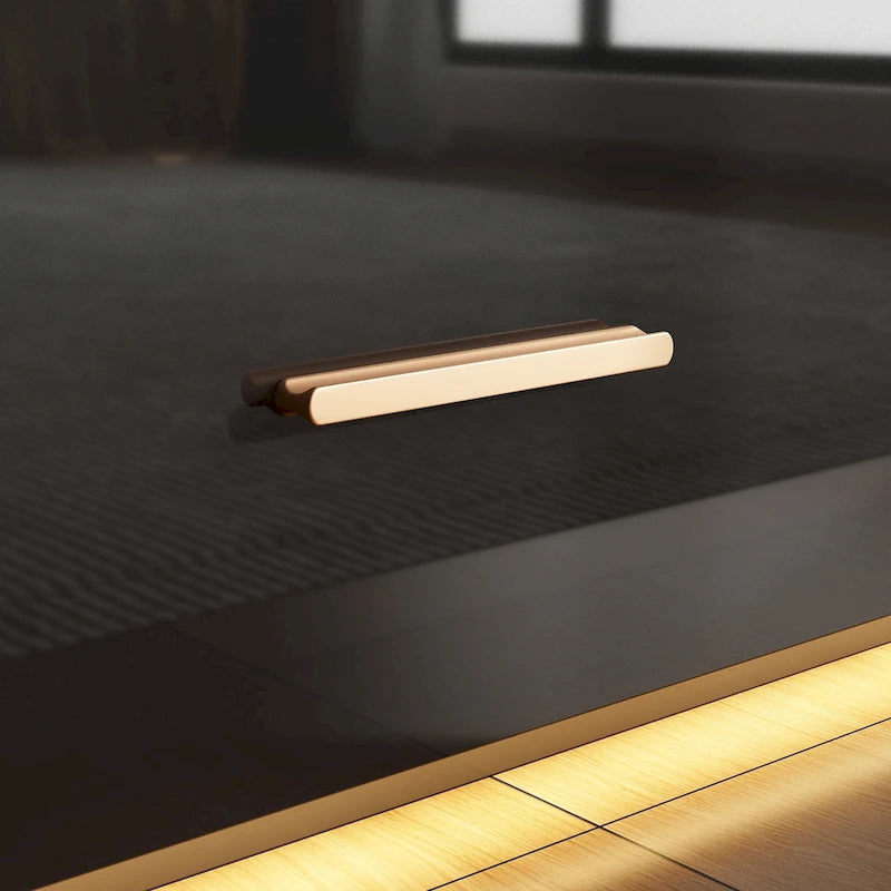 With its glossy black finish and contemporary clean lines, the LuxeVision Console creates an illusion of space by floating effortlessly above your floor. The golden-hued handles are not just accents; they are the embodiment of modern luxury that effortlessly blend with the minimalistic design.