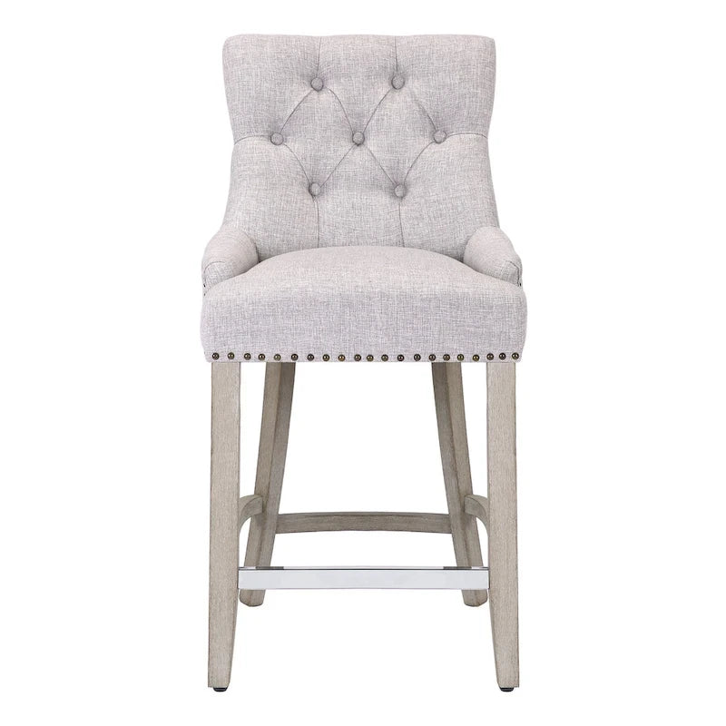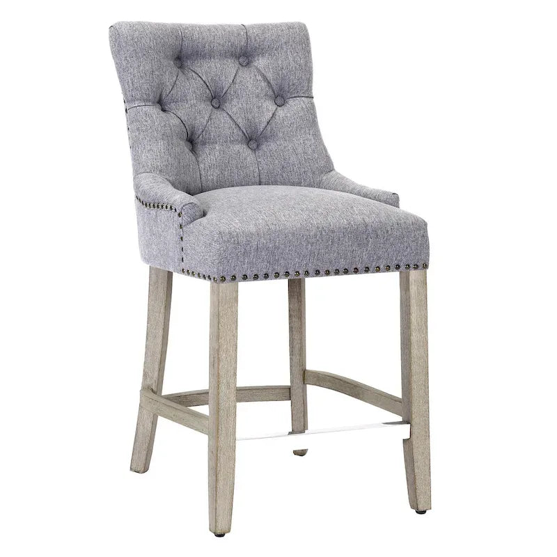 The supremely elegant design counter stool is sure to be a highlight of your space. Durable solid wood and thickly padded inviting upholstery for a smooth and lovely seat. Details like a diamond pattern button tufted back and rich nailhead accents offer a distinctive transitional look that you are sure to love.