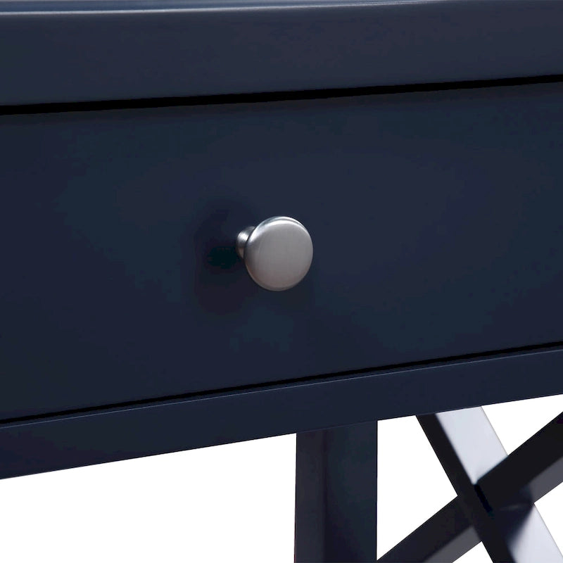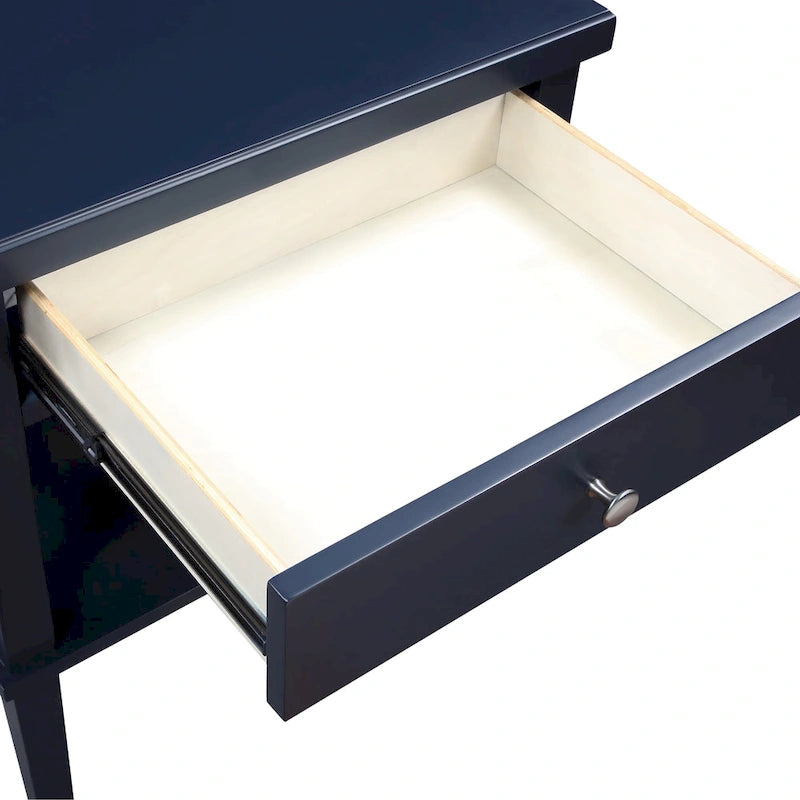 Keep your bedside essentials organized and within easy reach with this Copper Grove Castle Creek wooden nightstand with lower shelf. Crafted from solid hardwood and MDF, this nightstand offers sturdy construction and lasting durability. The spacious pull-out drawer features full extension metal glides and a brushed nickel pull for easy access. The decorative X-motif on the table sides and tapered legs add to the transitional style, while the open shelf provides additional storage space. Available in white, or midnight blue.