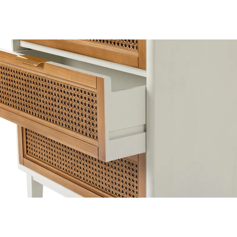 - Spacious drawers with woven cane fronts for interior storage