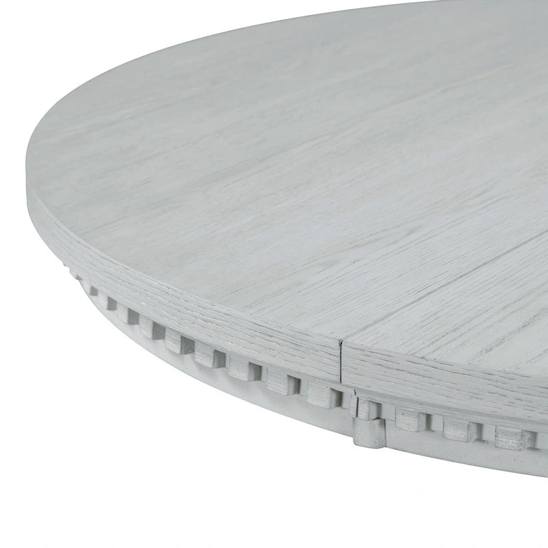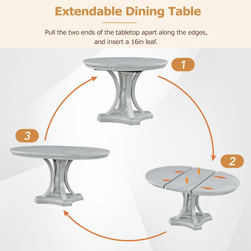 This 5-piece retro-style dining set includes a round extendable table and four upholstered chairs, perfect for family meals. The adjustable table expands from 42 to 58 with removable leaves, offering flexibility. Crafted from MDF with oak veneer and solid wood, it combines elegance with durability, ideal for a farmhouse-inspired dining room.
