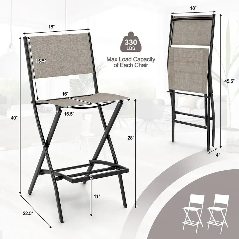 Sit on the comfortable bar chair and enjoy the relaxing moment.Crafted with premium fabric, the patio chairs set enables you to have a good relaxation. Besides, the practical footrest provides added optimal comfort.?Adopting sturdy metal frame, the outdoor bar chairs set has strong weight capacity and is Sturdy for long time service. You can place it at patio, porch for daily demands and easily fold it when not in use.