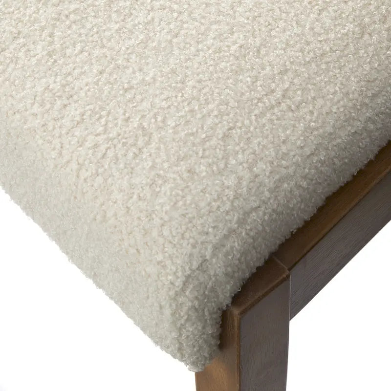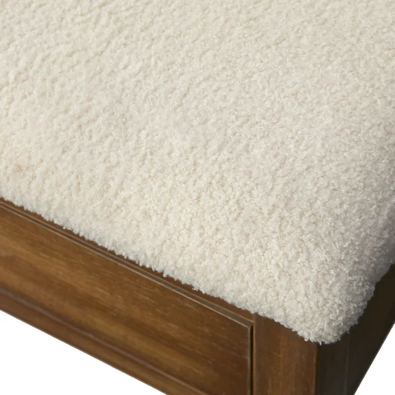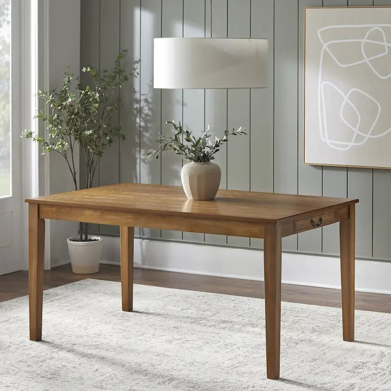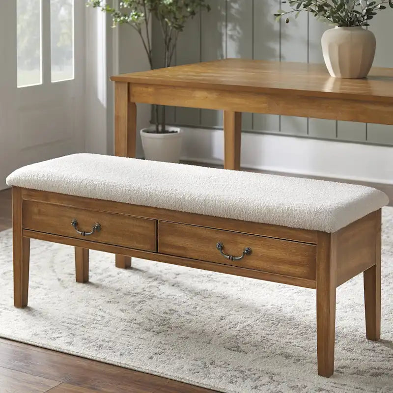 The Lifestorey Palmer 6-Piece Dining Set creates a beautiful space for all your gatherings, designed with unique features to elevate your dining experience. The centerpiece is an antique oak-finished dining table, which has two built-in drawers (one at each end) for storing flatware and other items. The dining chairs feature a wide-slat design, giving the set a distinctive allure. The dining bench adds a rustic elegance and has two drawers, perfect for keeping table linens and other dining accessories. Chairs and bench are crafted of solid rubberwood, generously cushioned and upholstered in an off-white boucle fabric for unique softness and texture. Table features solid rubberwood legs and MDF. The style is both rustic and transitional, coordinating easily with modern-farmhouse interiors. Set includes table, 4 chairs and one dining bench.Includes one table, four chairs and one bench Modern farmhouse design with rustic flair Table seats up to 6 and features built in storage drawers at ends Updated ladder back chairs with stylish boucle upholstered seats Table top crafted of MDF and solid Rubberwood legs Antique Oak finish with Antique Brass finished drawer pulls Chairs and bench crafted of solid Rubberwood, Boucle fabric and foam Antique Oak finish with Off-White upholstery Ships in four cartons Table dimensions: 29.5 inches height x 59 inches length x 35.5 inches depth Table top weight capacity: 176 lbs Drawer interior dimensions: 1.9 inches height x 16.25 inches width x 10.75 inches depth Drawer weight capacity: 11 lbs. Chair overall dimensions: 39.25 inches height x 20 inches width x 23 inches depth Seat dimensions: 19.25 inches height x 18.75 inches width x 17.5 inches depth Chair weight capacity: 250 lbs Bench dimensions: 19.25 inches height x 49.25 inches length x 16.5 inches depth Bench weight capacity: 220 lbs Drawer interior dimensions: 3.25 inches height x 19.25 inches width x 10.75 inches depth Drawer weight capacity: 11 lbs. Ships in multiple boxes