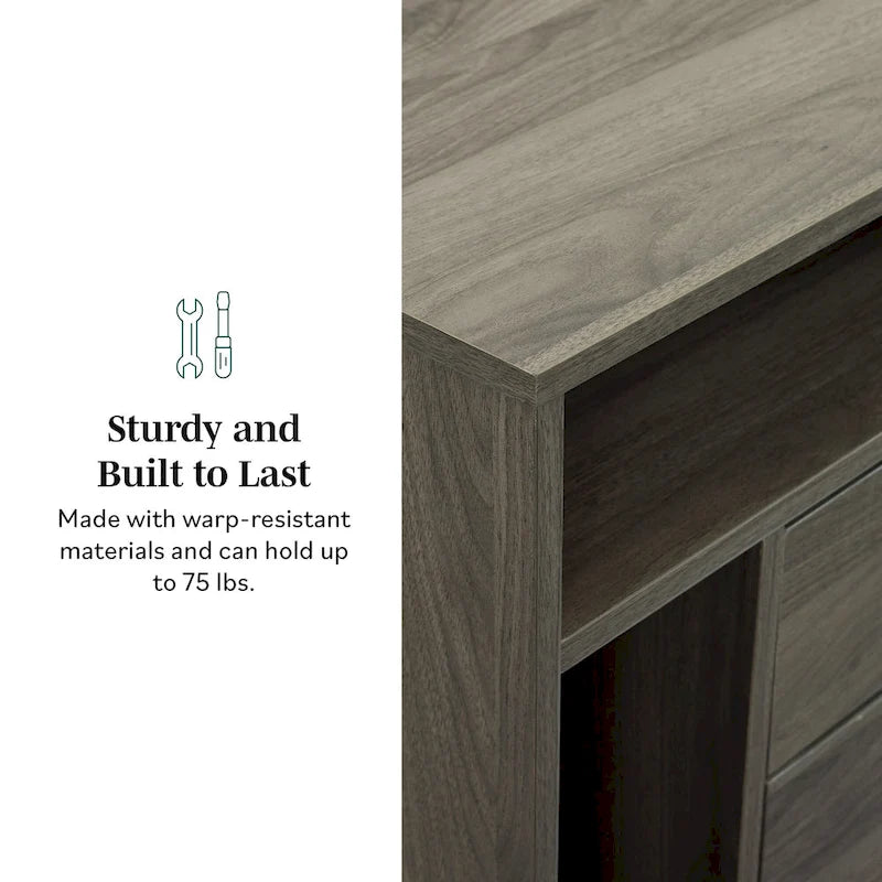 Add style and functionality to your bedroom with the Middlebrook Modern Storage Nightstand set. These mid-century inspired nightstands feature two drawers with telescoping metal glides, an open horizontal shelf with wire management, and a vertical slot for vinyl records. Made with high-grade MDF, high-quality laminate, and powder-coated steel, these nightstands are durable and versatile, perfect for use as a nightstand or living room side table. Assembly is required, but step-by-step instructions are included for easy setup.