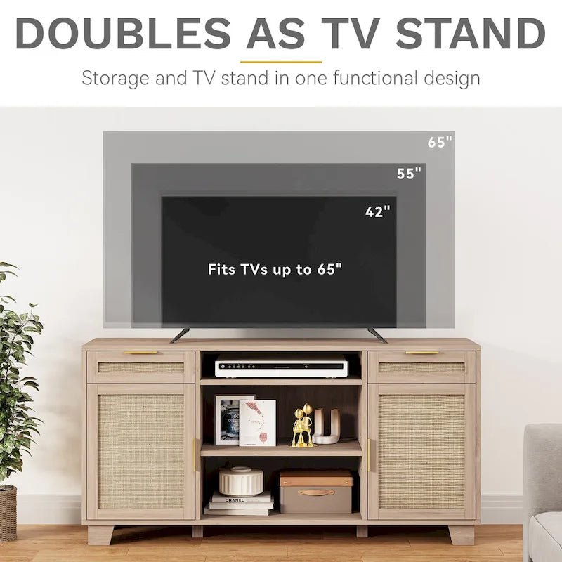 TV stand combines natural warm wooden finish with airy handwoven rattan to achieve a relaxed coastal feel. Modern lines and a minimalist profile can be paired with existing decor for eclectic elegance