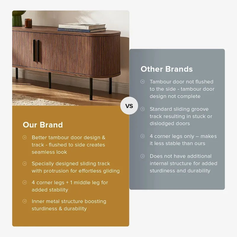 Introducing the Quin collection: the epitome of Mid-Century Modern furniture. Complete with oval silhouette and tambour doors, our Quin collection is a must-have for design enthusiasts. Elevate your home entertainment experience with the Quin TV Stand, a testament to superior craftsmanship, innovative engineering, and contemporary design. Crafted with a meticulous mixed material composition, the Quin TV Stand redefines durability and stability. Unlike others, our hidden metal structure ensures unparalleled sturdiness, providing a secure foundation for your prized electronics. Reinforced by metal iron powder coating legs, this stand offers unrivaled support, and creates a bold and contrasting look. To ensure seamless functionality and effortless user experience, sliding track with protrusion is specially engineered to glide effortlessly. Experience the perfect marriage of form, function, and durability with the Quin TV Stand. Upgrade your entertainment setup today and discover a new standard of excellence.