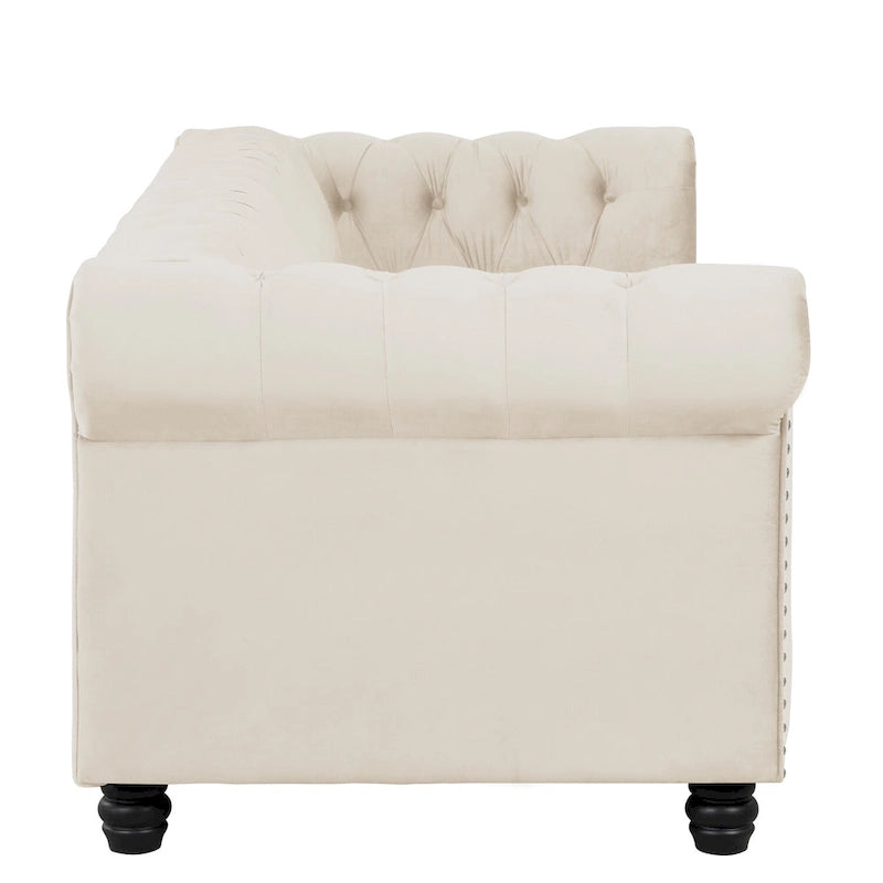 Experience the perfect combination of elegance and comfort with the Morden Fort Classic Tufted Upholstered Chesterfield Loveseat. This 2-piece living room set boasts a traditional Chesterfield style, complete with button-tufted accents, scrolled arms, and turned legs that catch the eye. The high resilience foam and polyester fiber wadding in the seat cushions provide a cozy and overstuffed construction for extra comfort and longevity. Crafted with a sturdy rubberwood frame, this loveseat is a testament to the superb craftsmanship and attention to detail that goes into each piece. The Dutch velvet fabric adds a distinctive soft touch and a gorgeous, luxurious, and elegant look that will elevate any living space.