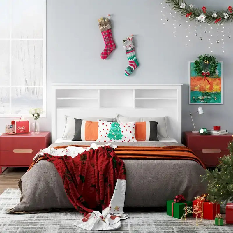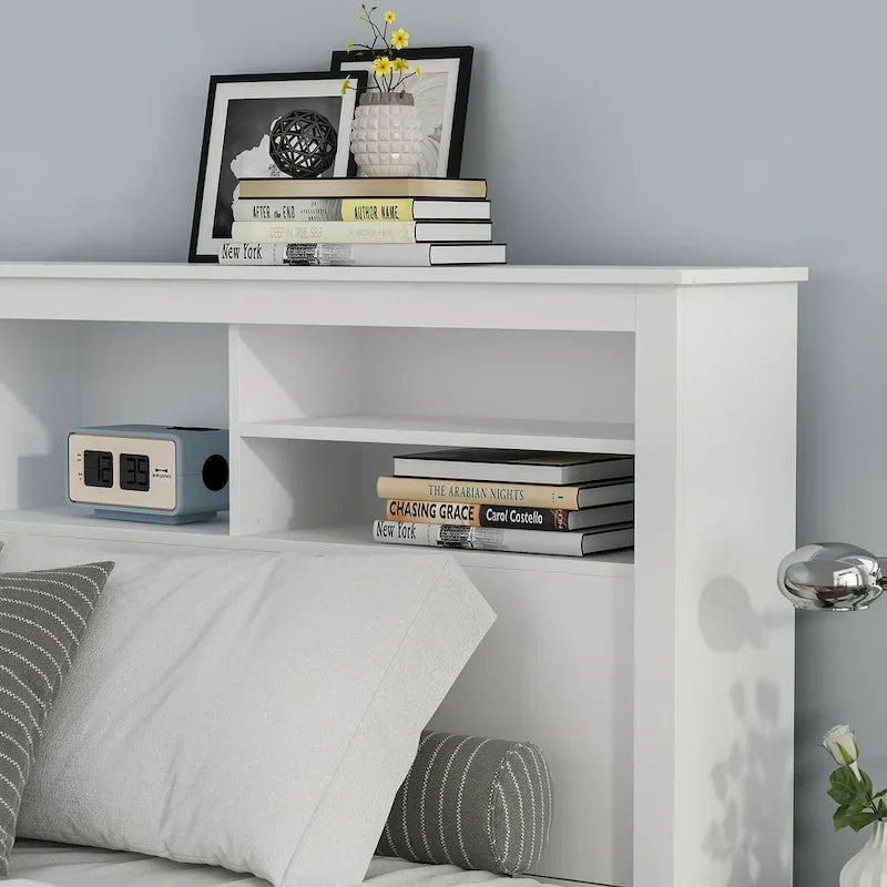 Upgrade your bedroom with this Queen Size Bookcase Headboard With A Hole For Passing Cords & Lights from the Fusion collection. Its minimalist design and neutral finish blend easily with any decor, while its spacious open storage spaces keep your room clutter-free. Plus, the added convenience of a hole for passing cords makes it easy to plug in your devices and lights. Choose between two options: one with a power outlet for easy charging, and one without. Product dimensions: 65 (l) x 11.8 (d) x 43 (h)
