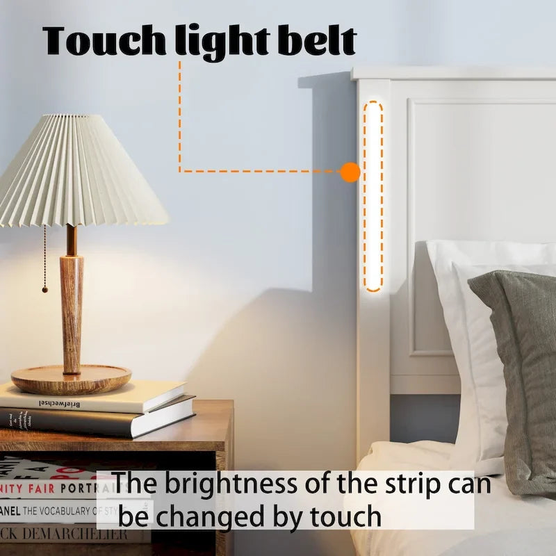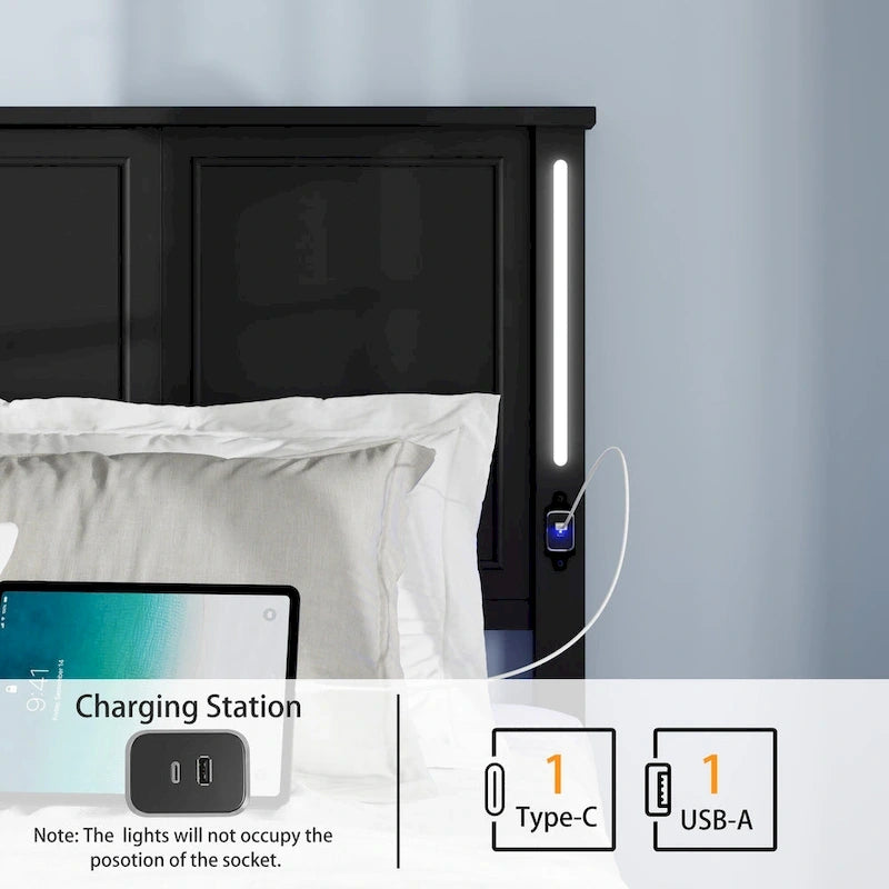 - Smart LED Light Bar Headboard: The storage headboard features 1 USB port and 1 Type C port, making it easy to charge your devices. The bed frame also boasts an impressive Smart LED light bar headboard. Simply touch the light bar for full brightness, or long-press to adjust the brightness to your preference.