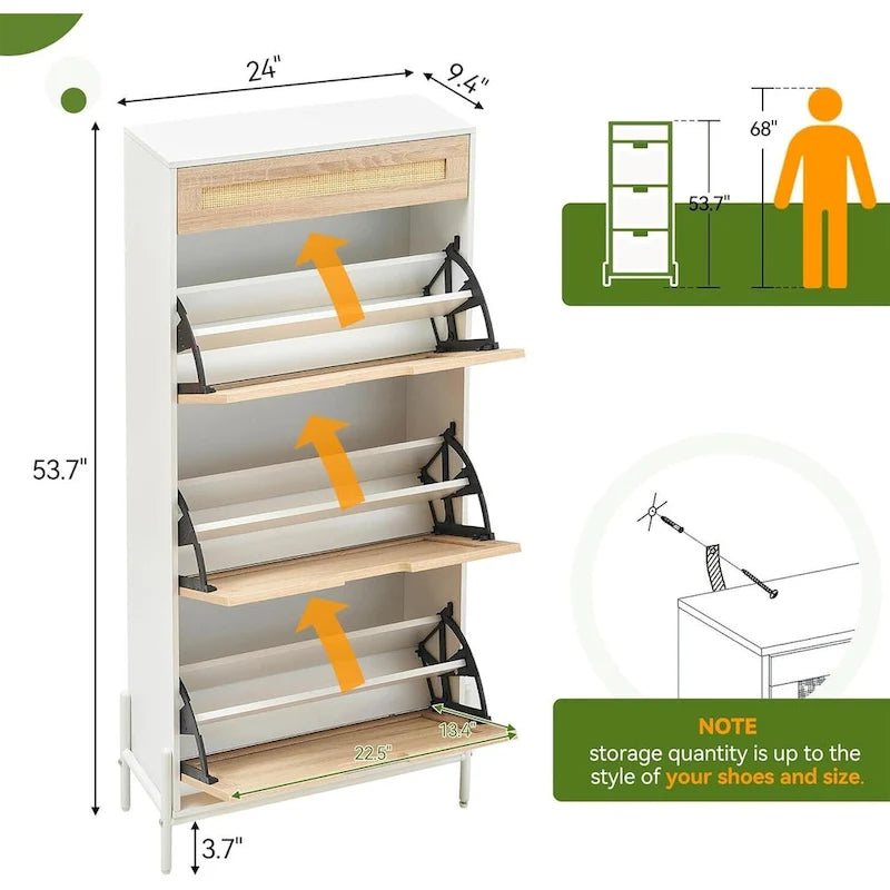 Stylish and Space-Saving Design: Our narrow shoe cabinet combines functionality with beautiful design. Crafted with hand-woven rattan and sturdy MDF, it seamlessly integrates into any room decor, from the entryway to the living room. The slim item is suitable for maximizing space in smaller areasEfficient Shoe Storage Cabinet: This rattan shoe cabinet features cleverly designed flip drawers, allowing for hidden shoe storage. With space to accommodate up to 24 pairs of shoes, the cabinet maintains a tidy and organized entryway. Adjustable compartments offer versatility for storing everything from sandals to mid-calf shoesUser-Friendly Design: The shoe cabinet for entryway offers easy access with smooth flip drawers that open and close effortlessly. The bottom area is perfect for storing slippers or accommodating cleaning tools. The back design ensures good ventilation, keeping shoes freshSafety and Stability: Our shoe organizer for entryway is designed with safety in mind. Featuring an anti-tip design, it can be securely anchored to the wall to prevent tipping. The metal support legs not only add style but also keep the shoe rack for entryway stable and separated from ground moistureSimple Assembly and Maintenance: Assemble your shoe storage cabinet quickly with the provided instructions and tools. Designed for hassle-free maintenance, the shoe rack can be cleaned easily with a damp cloth, keeping it looking great and functioning well over time