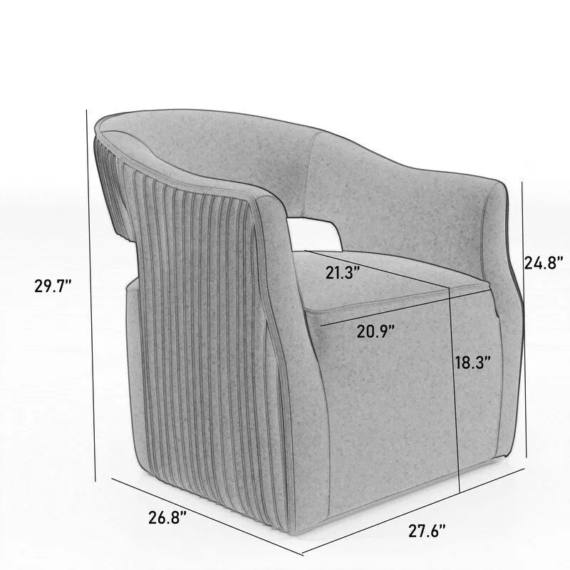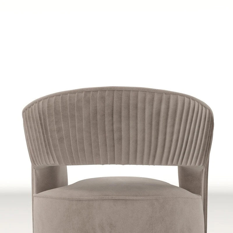 This luxurious seat is upholstered in soft velvet fabric, giving it a feeling of regal elegance. It is equipped with a 360 swivel mechanism that rotates smoothly and freely for maximum convenience. The sturdy metal base of the chair ensures stability and durability. The unique hollow backrest design is a highlight, adding a touch of modern sophistication. In addition, the backrest has a delicate pleated trim that enhances the overall aesthetics and provides additional comfort and support.