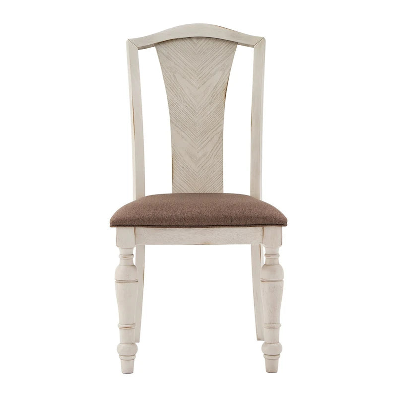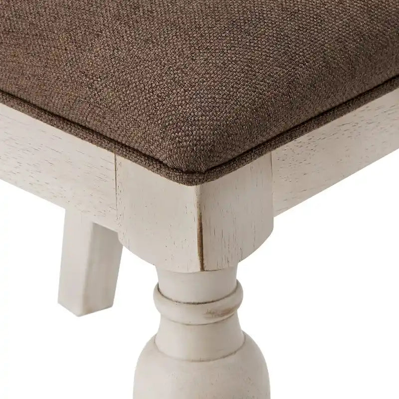 - Dining chair has antique white finish frame and dark brown fabric upholstery