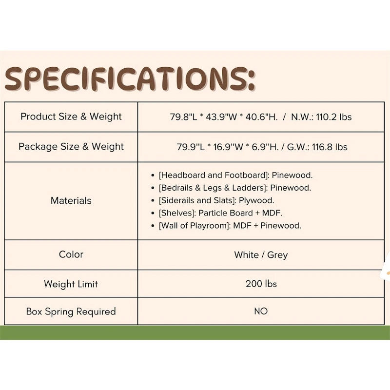 - [Sturdy Construction Loft Bed] - This low twin loft bed with storage shelves is constructed from high-quality materials, including solid pine wood, Particle Board, MDF board, and plywood. It can enhance stability and durability as well as ensure a long lifespan. The strengthened frame is capable of holding up to 200 lbs on the top loft bed.