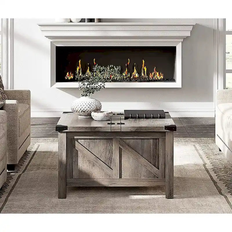 - LARGE STORAGE SPACESThis television stand comes with 2 cabinet storage spaces with barn doors and 2 open spaces with a 3-level adjustable in the middle, providing abundant storage or display space for CDs, DVDs, gaming box, decorations, etc..The large square coffee table comes with a hidden storage cabinet of 136L space for organizing and storing your daily necessities. Spacious table top (30 L x 30 W) for all your daily needs.
