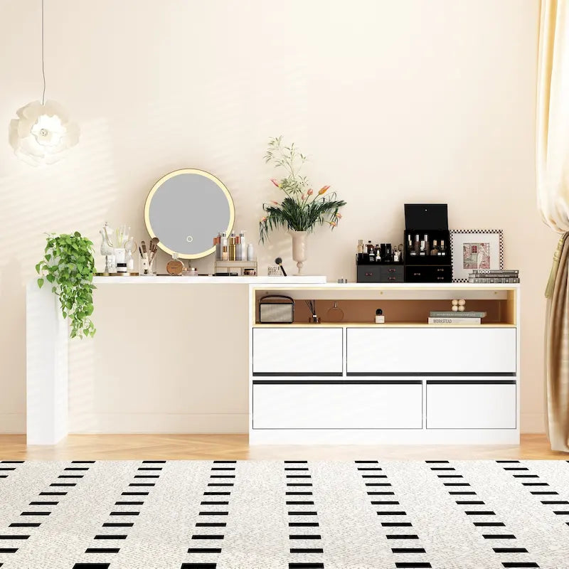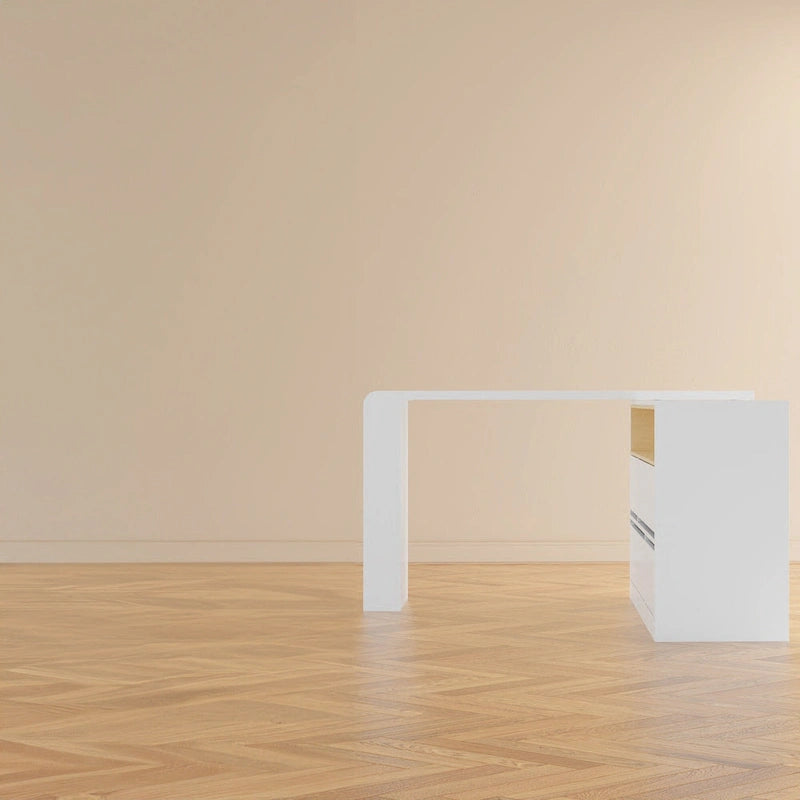 This 4-drawer desk dresser and simple vanity desk set has a streamlined look that elevates your modern decor. It's made from engineered wood with a white finish that goes with nearly any existing color scheme. The dresser has four drawers to provide a place for everything from sweaters to denim. Handle-less drawers and a solid apron base complete the contemporary feel of this dresser. We love that it comes with an L-shaped minimalist desk or vanity that pivots direction if you need it to. (Mirror Not Inclued)