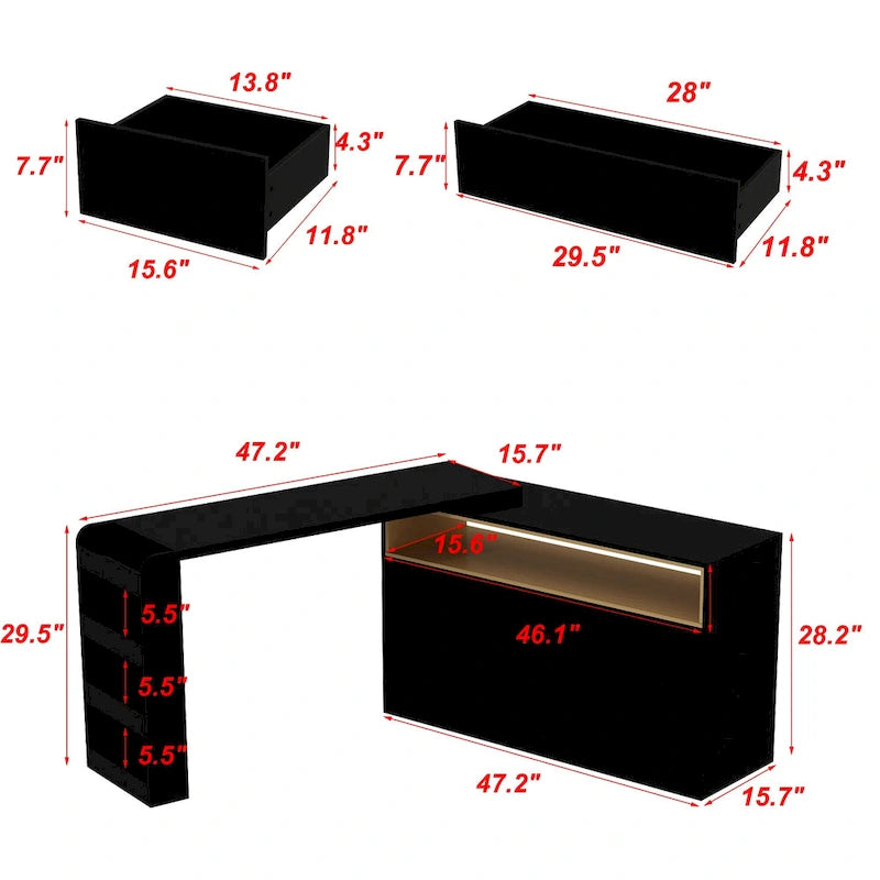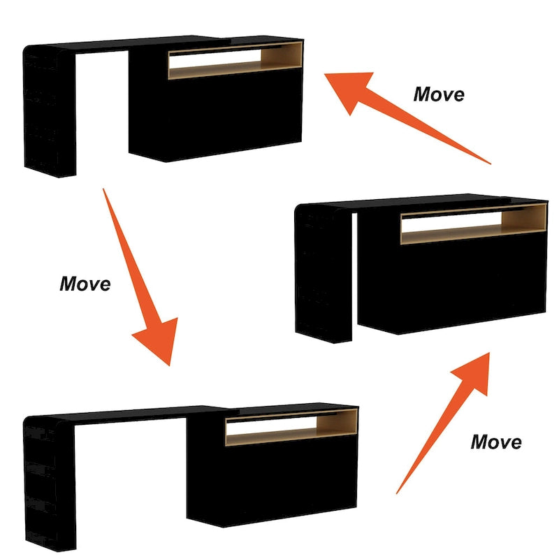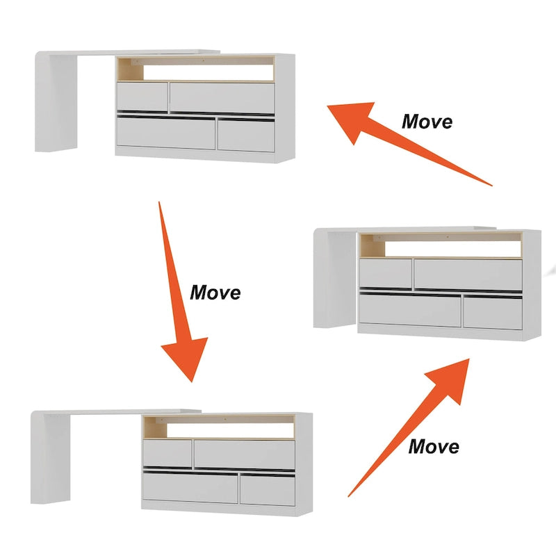 This multi-purpose furniture can serve as a desk, a vanity, or a sideboard, catering to your different needs and preferences. It features four spacious drawers, providing ample storage space for your belongings. Additionally, it comes with a movable tabletop that can be positioned flat or in an L-shape, offering flexibility and adaptability to suit your working or grooming needs.