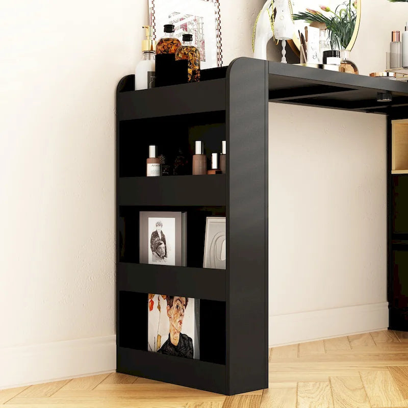 On the side, you'll find convenient shelves for storing small items such as cosmetics, spices, or other essentials. The open display area allows you to showcase and easily access frequently used items. The contrasting colors add an elegant and fashionable touch, effortlessly blending with any room style or decor.