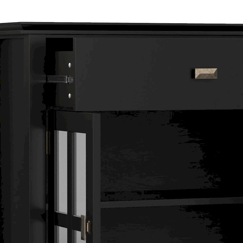 - Four tempered glass-panel doors protect contents while elegantly displaying your items, with two adjustable shelves for versatile storage options