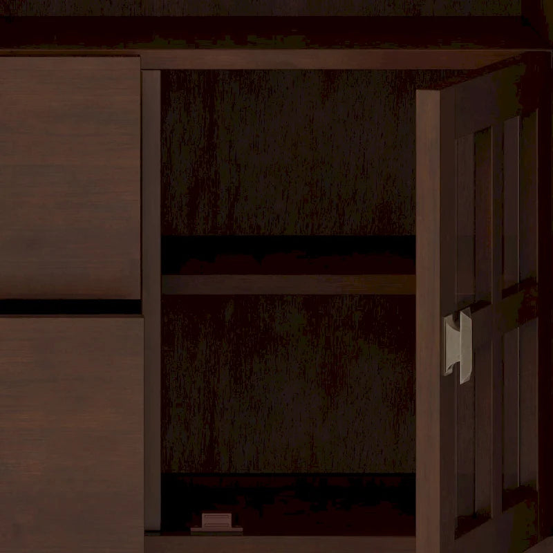 - Features two (2) central drawers with metal glides, open top storage area and two (2) side tempered glass framed doors that open to large storage spaces with one (1) shelf each